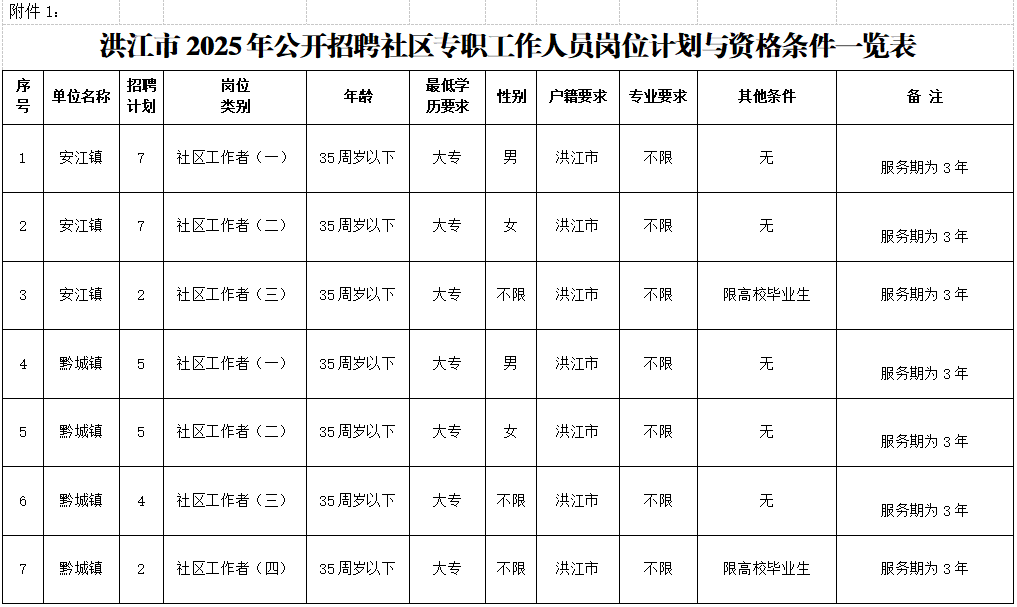 附件:1.洪江市2025年公開招聘社區專職工作人員崗位計劃與資格條件一覽表
