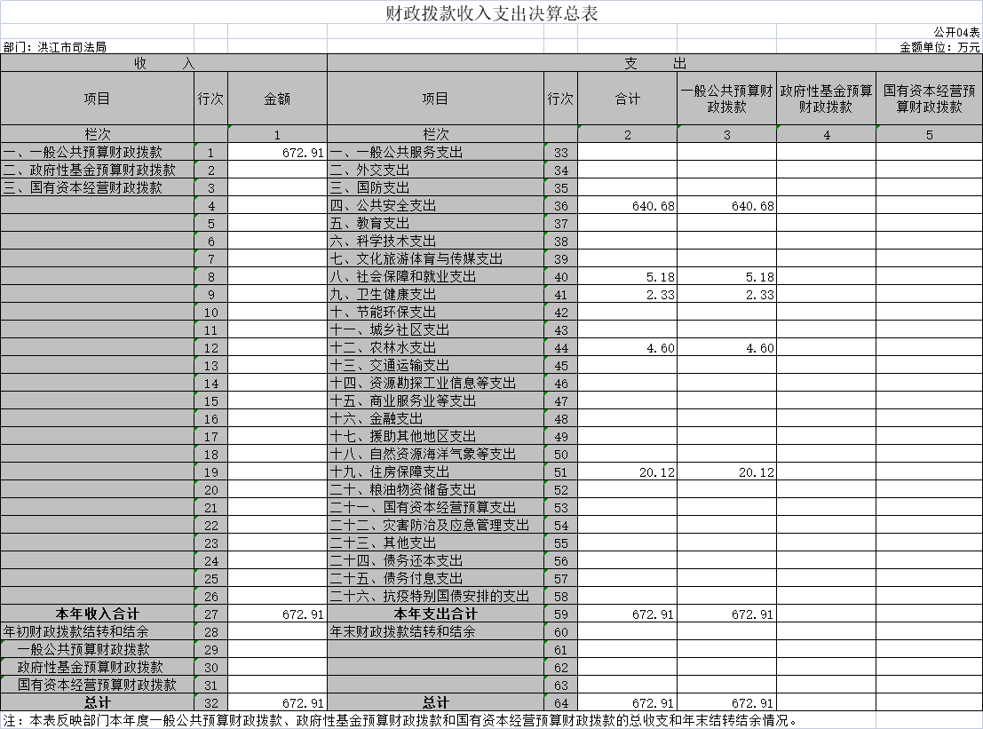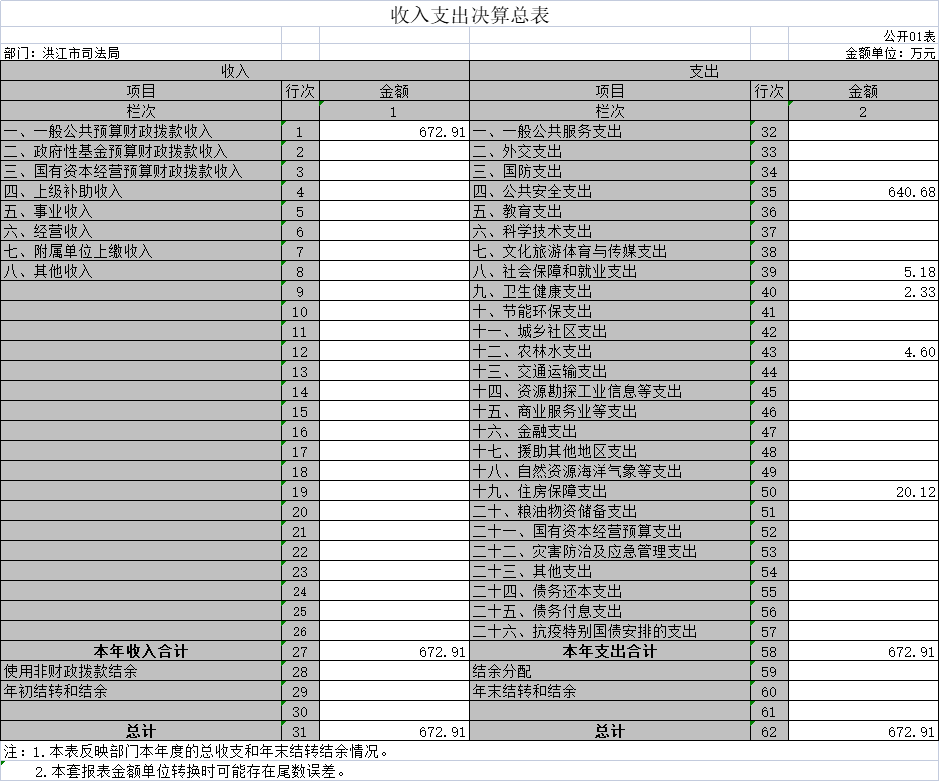 2021年度收、支總計672.91萬元。與上年相比,減少200萬元,減少23%,主要是因為減少法律援助、社區矯正、人民調解法律咨詢服務等項目投入,2021年獎金未支付到位。
