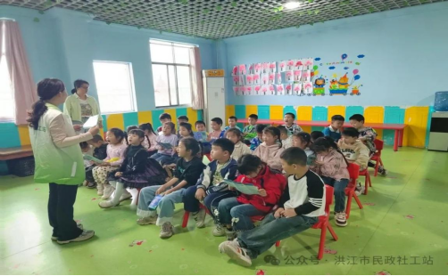 活動(dòng)現(xiàn)場,社工和托口鎮(zhèn)政府工作人員化身“安全老師”,采用生動(dòng)有趣的方式,結(jié)合幼兒的認(rèn)知特點(diǎn),通過播放動(dòng)畫視頻、情景模擬、互動(dòng)問答等形式,將防溺水、防性侵、防欺凌知識融入其中。