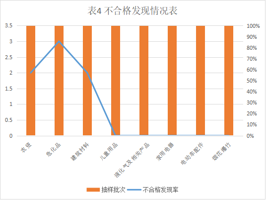 建筑材料(共10批次,不合格2批次,合格率80%)、危化品(共47批次,不合格3批次,合格率93.62%),抽查不合格項如表3 所示: