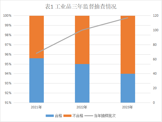 根據(jù)懷化市市場監(jiān)督管理局《2022年度懷化市政府質(zhì)量考核方案》中對工業(yè)產(chǎn)品監(jiān)督抽檢任務安排,洪江市市場監(jiān)督管理局2023年須承擔100批次工業(yè)產(chǎn)品質(zhì)量監(jiān)督抽檢工作,實際完成117批次,完成率117.00%。涉及抽檢環(huán)節(jié)包括流通環(huán)節(jié)、生產(chǎn)環(huán)節(jié),抽檢場所主要為生產(chǎn)企業(yè)、加油站、大型超市、銷售門店等。共計117批次,合格樣品110批次,不合格樣品7批次,工業(yè)產(chǎn)品整體合格率為94.00%,較去年下降1個百分點。如表1 所示: