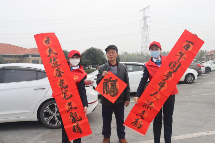 冬日暖陽,春節(jié)腳步臨近。1月11日,在G65包茂高速公路洪江服務(wù)區(qū)內(nèi),繁忙而有序。在服務(wù)區(qū)一側(cè),懷化分公司的“路燈”志愿者正在現(xiàn)場揮毫潑墨、寫福送春聯(lián),洋溢著濃濃的喜慶氛圍。活動現(xiàn)場引來許多司乘朋友圍觀,有的直接挑選已經(jīng)寫好的“成品”,有的則根據(jù)自己的需要邀請志愿者為他們“量身定制”。一幅幅紅春聯(lián)和金燦燦的“福”字滿載著新春祝福,傳遞著濃濃溫情。