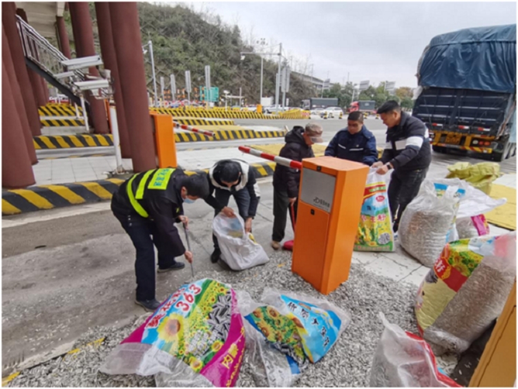 貨車經過懷化南收費站時,車上瓜子大量傾瀉,收費班長周明生組織人員幫忙清理。