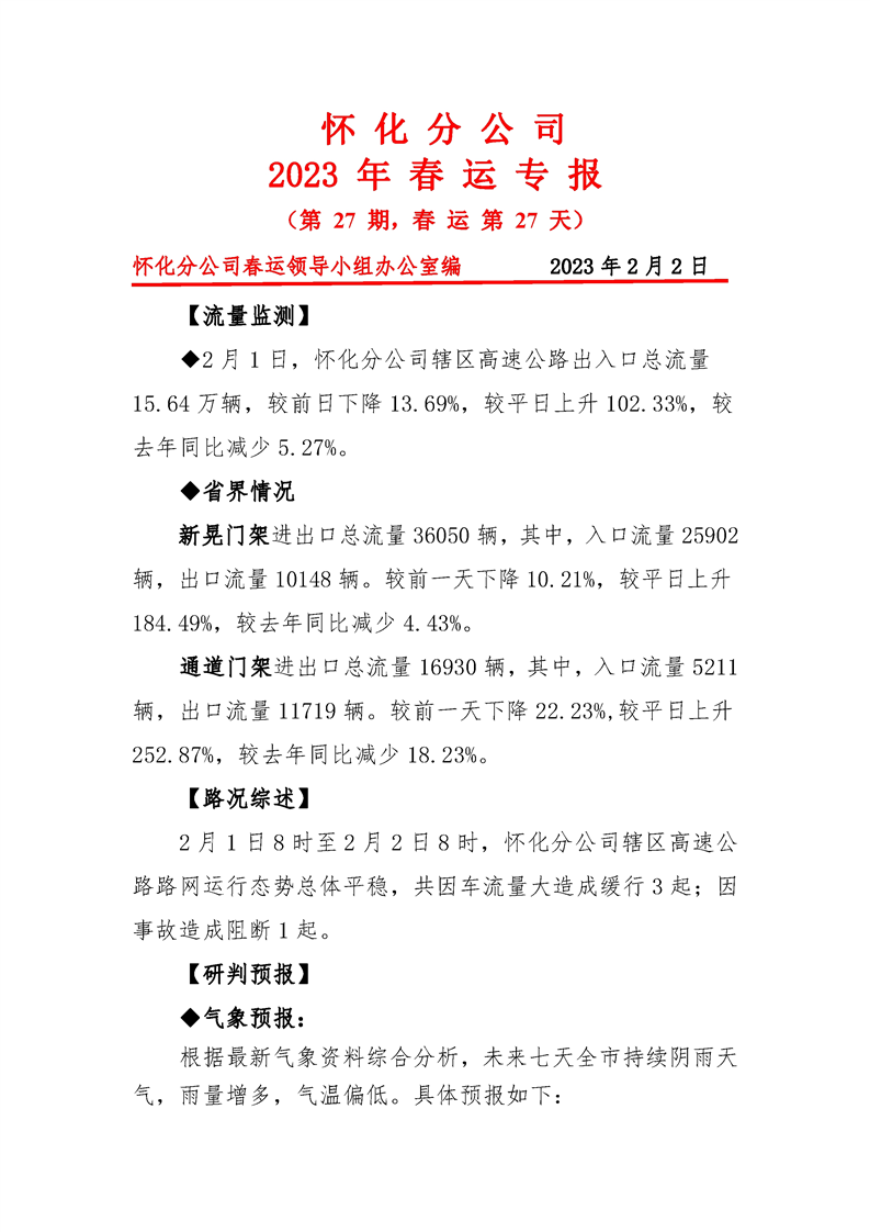 2023年懷化分公司春運專報-第27期