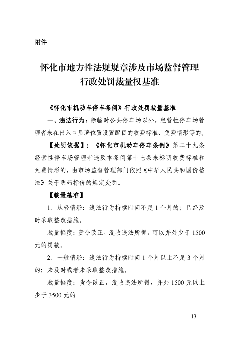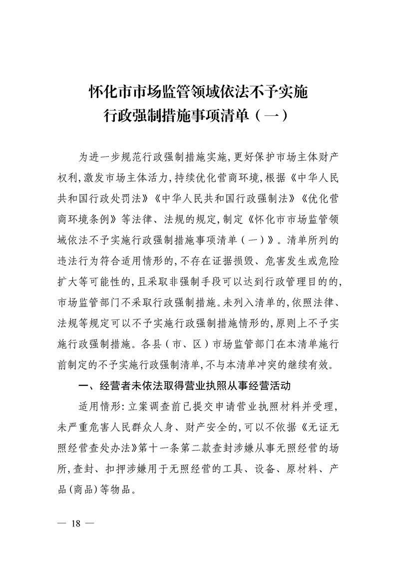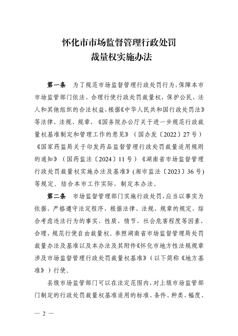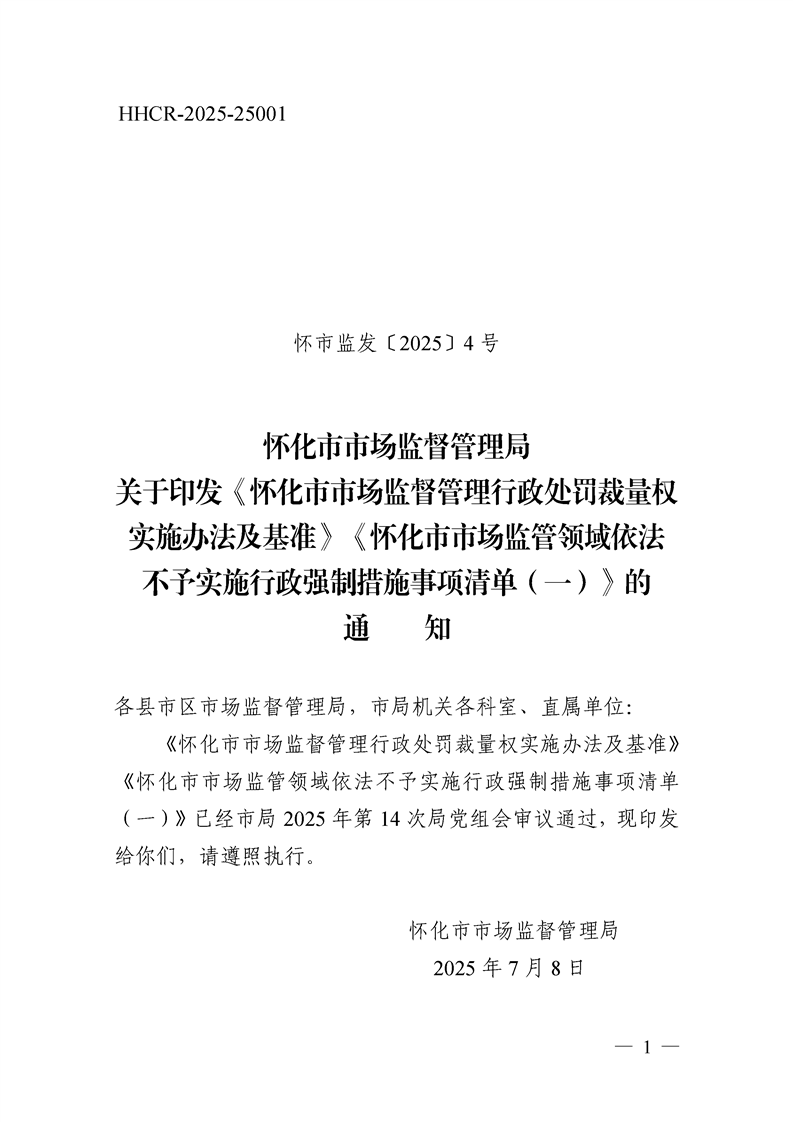 關于印發《懷化市市場監督管理行政處罰裁量權實施辦法及基準》《懷化市市場監管領域依法不予實施行政強制措施事項清單(一)》的通知